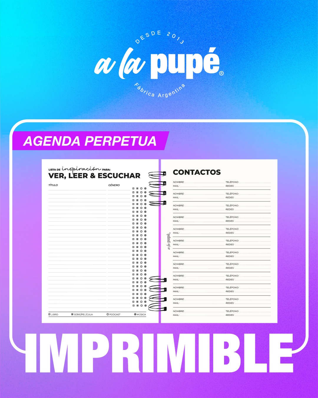 Secciones Especiales: Listas de inspiración (libros, podcast, series), contactos, contraseñas y 20 hojas libres para notas.